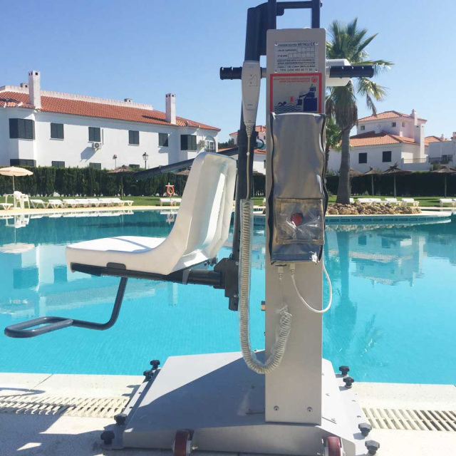 Портативний акумуляторний підйомник для інвалідів METALU 600. Не вимагає установки, тому його можна використовувати в будь-якому місці басейну, у різних басейнах на одному корпусі або зберігати, коли він не використовується. Має поворотний важіль, поставляється із сидінням, підставкою для ніг та відкидним підлокітником. Пристрій із нержавіючої сталі AISI 316 із захистом порошковою фарбою та з електричним механізмом (акумулятор 24 В).