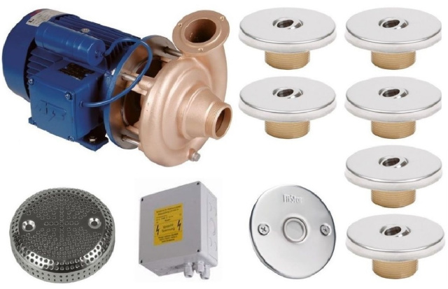 Гідромасаж комплектується бронзовим насосом, пневмокнопкою, шістьма форсунками для гідромасажу, водозабірною форсункою, блоком управління.