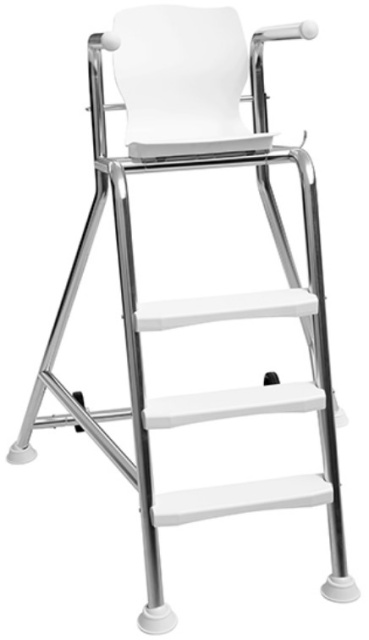 Крісло рятувальника Golfinho MS044.150. Виконано з нержавіючої сталі марки AISI 316, стійкої до корозії, впливу ультрафіолету та хімічних реагентів. Сидіння та сходинки – з пластику. Виготовлено із труби діаметром 43 мм. Обладнано колесами для зручного транспортування. У комплект входить тримач із нержавіючої сталі AISI-316 для рятувального круга. Круг купується окремо.