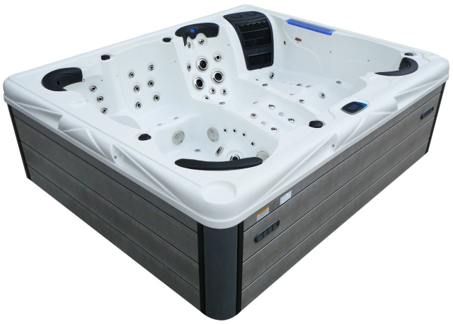 Aquajoy Saint-Tropez – це сучасний СПА-басейн з 5 сидячими та 2 лежачими місцями. Обладнаний 97 гідротерапевтичними, 4 циркуляційними та 16 аерофорсунками. Має 4 вбудовані підголівники для більш комфортного розміщення всередині басейну. Чаша виготовлена ​​з акрилу провідної американської торгової марки Aristech® Acrylic. Пінополіуретан високої щільності на чаші та фольгована ізоляція товщиною 15 мм на корпусі забезпечують оптимальну теплоізоляцію. СПА-басейн оснащений автоматичною системою захисту від замерзання, нестачі води та перенапруги. Панель управління та система контролю виготовлені одним із найкращих американських виробників Balboa. Розміри: 280х230х95 см Об'єм: 2000 л Кількість форсунок: 117