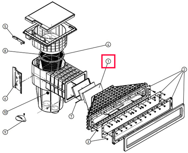 Комплект переливного шлюзу X-Line призначений для скімера Hayward X-Pro 600. Він використовується для з’єднання скімера з переливною системою басейну. Забезпечує надійну та герметичну установку. Цей товар зображено на схемі під №1.